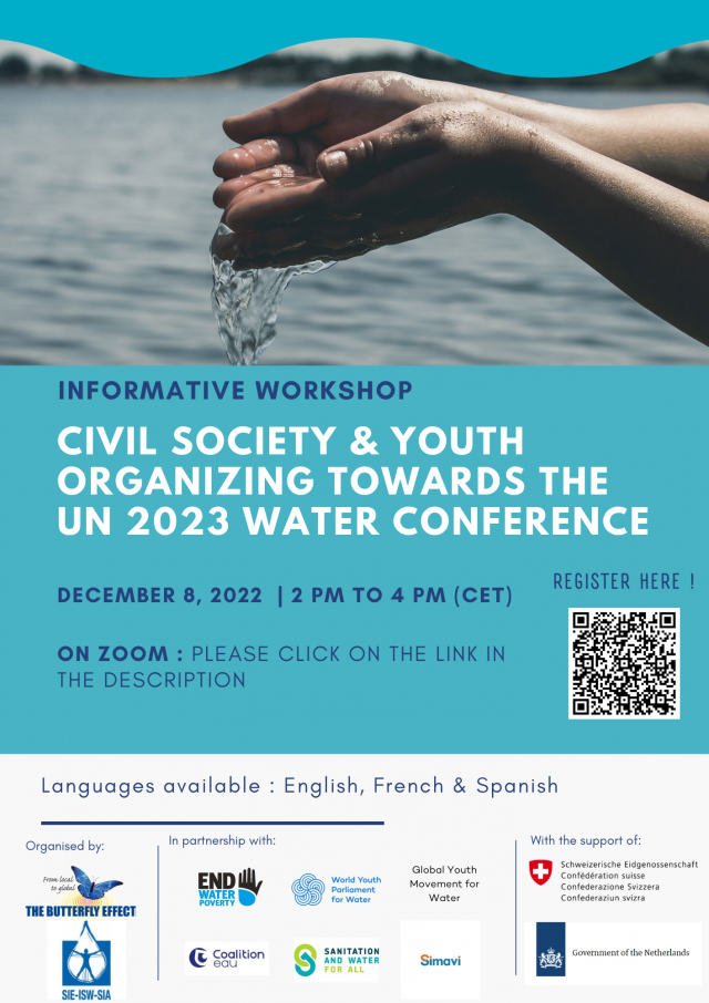 En décembre 2022, le Secrétariat du Butterfly Effect – assuré par le Secrétariat international de l’eau (SIE) - , en collaboration avec End Water Poverty, la Coalition Eau, Sanitation and Water for All, Simavi et le Mouvement Global de la Jeunesse pour l’eau a organisé deux ateliers en ligne visant à :